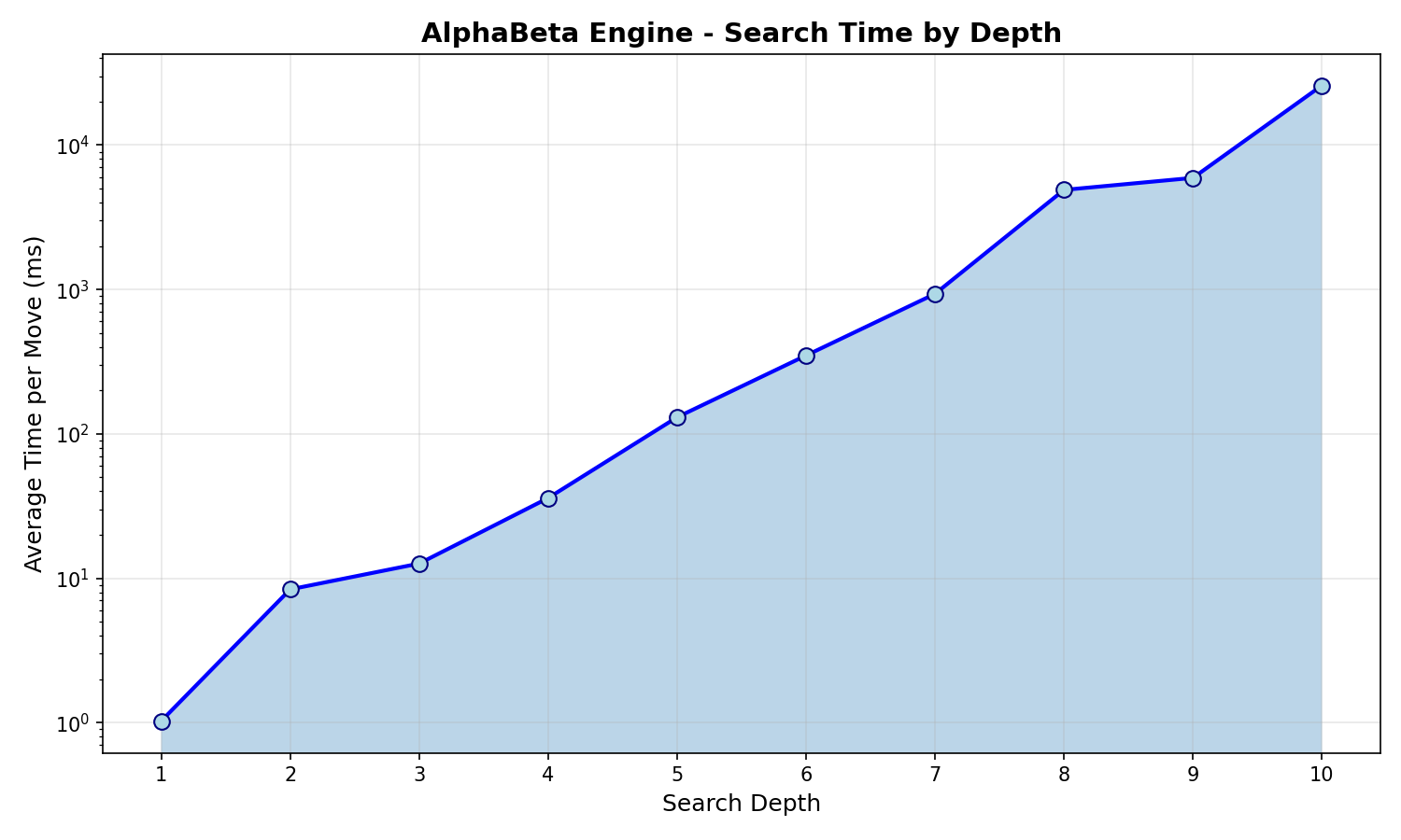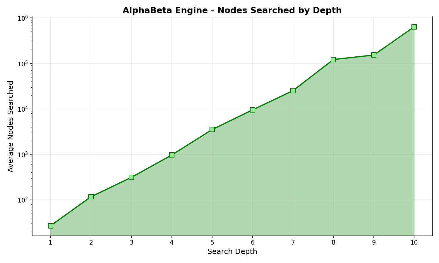 AlphaBeta engine search performance at different depths: